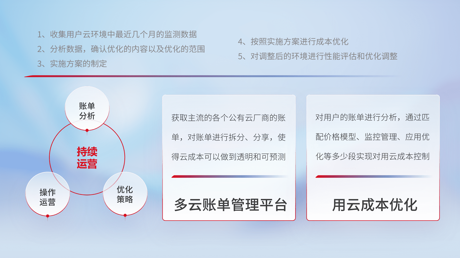 通过多云纳管,,,以统一的资源数据模型把客户的云资源进行抽象和封装,,,进而实现对多云资源的统一操作,,,保障云资源管理的可靠性、、、稳定性与可用性。。。。量身定制化运维内容,,配置、、开发运维、、、补丁管理、、、备份、、、、监控、、认证和访问管理、、、审计和日常巡检等,,保障在用云过程中的可靠度,,稳定度以及高可用率。。。。